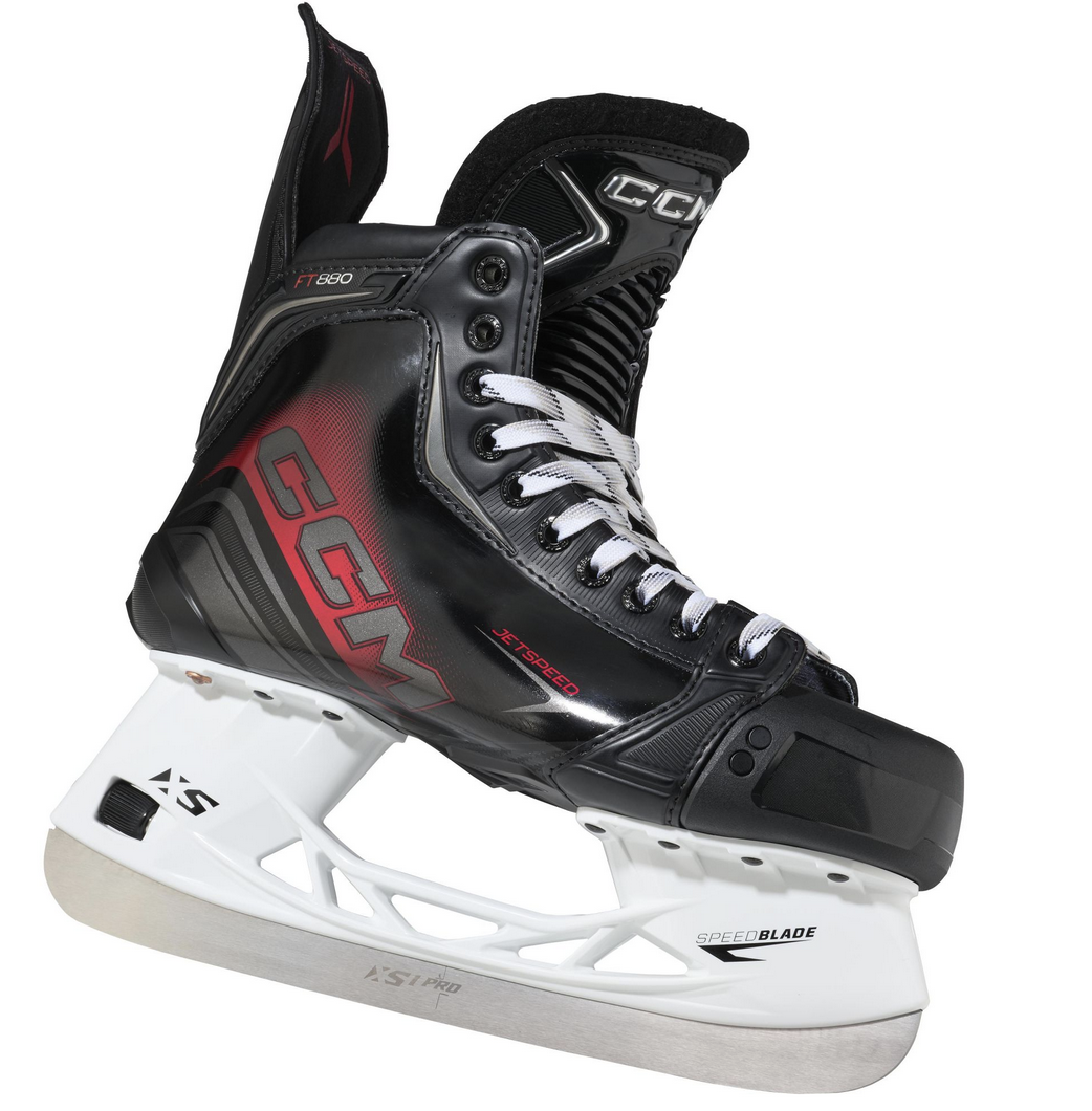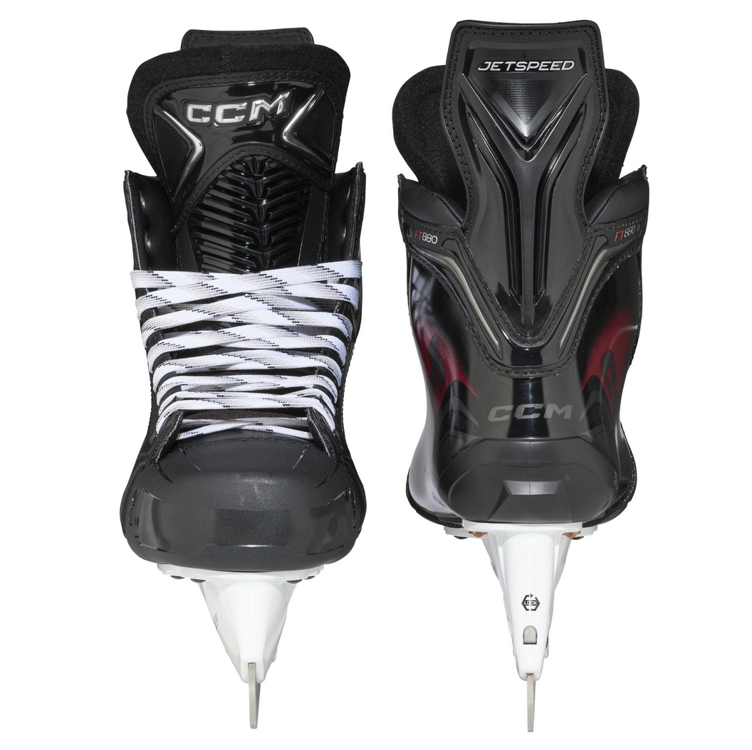 Łyżwy JETSPEED FT880 oferują wysoką prędkość i wygodę dzięki jednoczęściowemu butowi zapewniającemu lepsze przenoszenie energii i wkładce Totaldri Pro, która utrzymuje stopy w suchości. Pianka z pamięcią kształtu ADPT zapewnia ścisłe dopasowanie, a 7-milimetrowy język z filcu z wtryskiwaną ochroną przed wgryzaniem się w sznurowadła zapewnia wsparcie. Nowy kąt pochylenia do przodu zapewnia bardziej naturalną postawę do ataku, dzięki czemu gracze mogą być szybsi na palcach i czuć się bardziej wybuchowo w swoich krokach. Uchwyt SpeedBlade XS z metalowym kołkiem System BladeLock umożliwia szybką wymianę ostrzy, a płozy XS1 Pro ze stali nierdzewnej zapewniają lepsze kąty ataku i długotrwałe utrzymanie krawędzi.