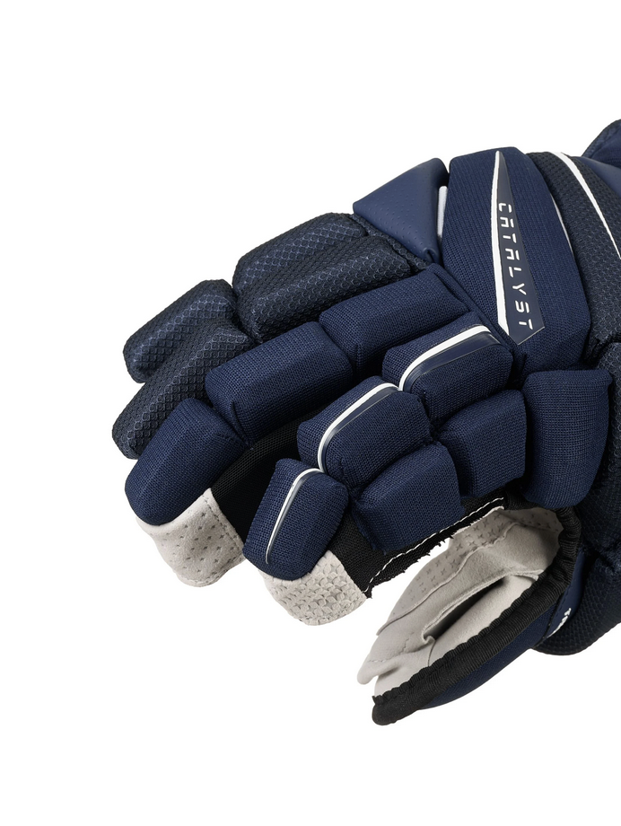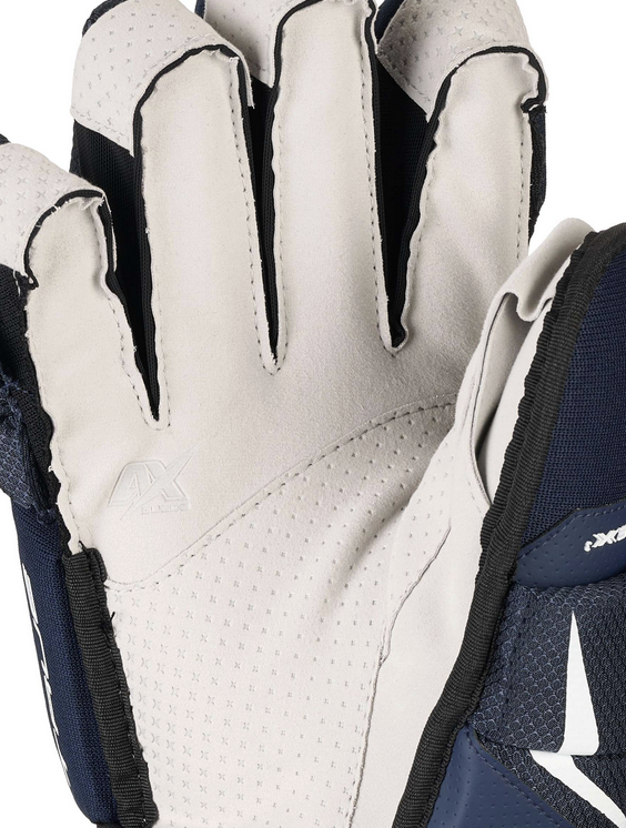 Trzyczęściowy kciuk i palce zapewniają doskonałą mobilność i kontrolę, pozwalając graczom na pewny, pewny chwyt kija. Wnętrze dłoni wykonane w całości z zamszu AX Suede poprawia czucie i trwałość, a wydłużona powłoka na wstawkach na palcach zapewnia lepsze krycie i lepszą ochronę wokół palców.